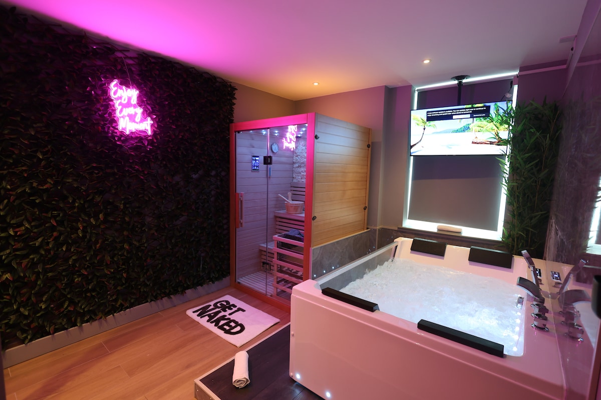 Visit London with Your Own Private Spa! 5min walk from Underground Station-30min to City Center. Double Jacuzzi bath for romantic time with your Love one as well as shaped for two Sauna with Aromatherapy equipment. 42" TV for Bath and Sauna. Bedroom designed to fit everything you need as a couple to spend perfect time together. There is a 7:1 Cinema System with top spec speakers located for dolby surround and 72" screen +4K Smart Projector. 50ShadesOfGrey Corner for Brave Couples Experience+ ;)