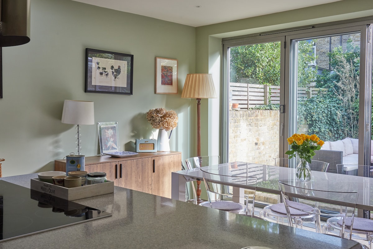 Modern Chic Central London Home with Garden Welcome to our stylish London home, perfectly located in the heart of the city.Sitting room opens seamlessly into a south-facing garden through elegant bi-folding doors, creating a bright atmosphere. With a cozy L-shaped sofa, a classic Egg chair, a dining table. The home features a newly integrated kitchen, fully stocked with essential supplies, and a luxury shower room. Just a 15-minute walk to some of London’s most iconic landmarks.