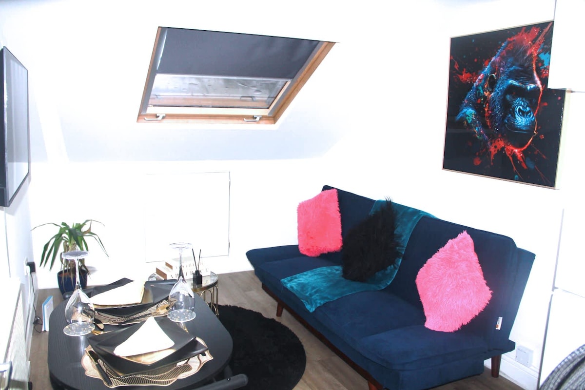 Welcome to our luxurious, spacious loft studio! Designed by an interior designer, this self-contained gem features a private bathroom and fully equipped kitchen, washing machine, king size built-in bed and ample storage. Light and airy with a living area and a stylish dining area. Large sliding windows to let a gentle breeze in. Situated on the top floor of our Victorian house on a quiet, residential street in Zone 3, London. Free on-street parking.