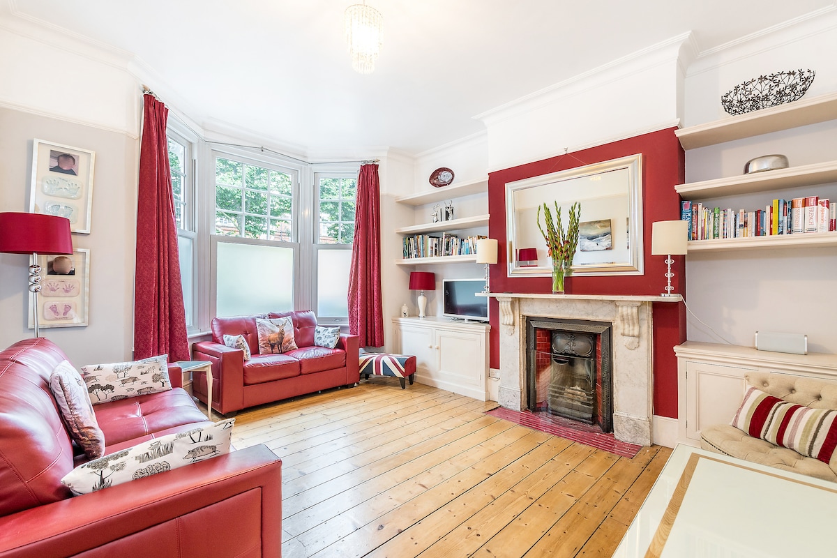 Situated on a beautiful large plot, our 5 bedroom detached Edwardian house has the feeling of a country home with large beautiful garden (with hot tub) and over 3,500 square feet of space for you to enjoy. The living spaces are numerous with a large sitting room, morning room, dining room, office, open plan kitchen/living space and an additional living space in the loft. The wifi is super fast with access points throughout to ensure coverage, and we are right opposite a beautiful park.