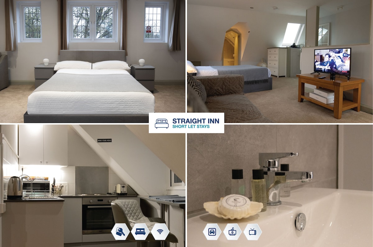 Enjoy unparalleled comfort in our top-floor 2BR flat in central Epsom, just 5 min from the station & high street. Sleep soundly in a king, double, or single bed, and relax in a stylish space featuring a 55" Smart TV, espresso machine, and more. Benefit from secure parking, a peaceful setting, and proximity to town. Modern aesthetics meet practicality in our recently refurbished, secure building. Ideal for exploring Surrey or soaking in the quiet. Your serene, chic getaway in the heart of it all!