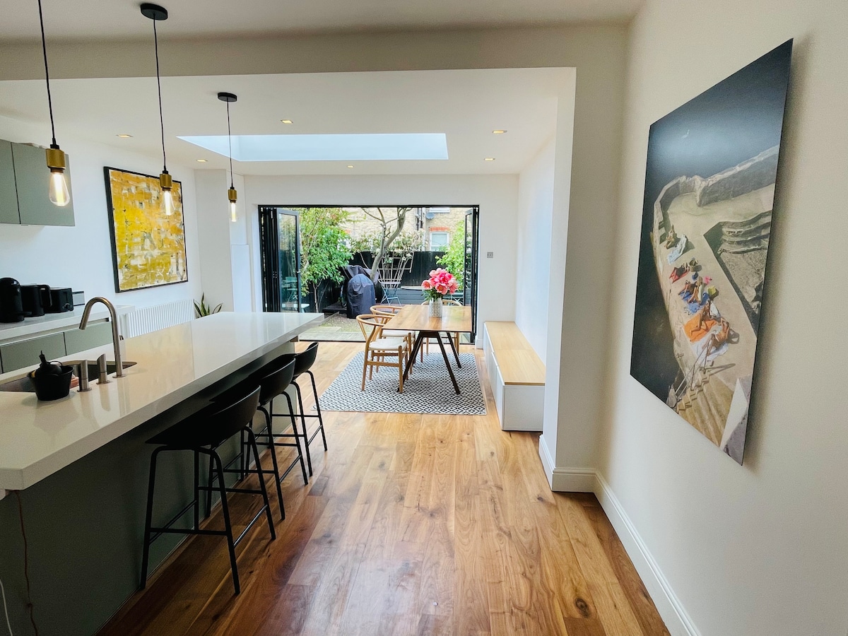 Calm, stylish Clapham home on a quiet residential street, just 5 minutes to Clapham North Tube and Overground trains. Ideal for couples or families of five, with a Super King bedroom plus three single sofa beds so no one has to share. High ceilings, sunny bay window, beautifully designed interiors, full kitchen with marble breakfast bar, strong shower, blackout blinds, hotel-quality linens, fast 100Mb Wi-Fi, and a private terrace with bay trees and BBQ. Free street parking after 5:30pm.