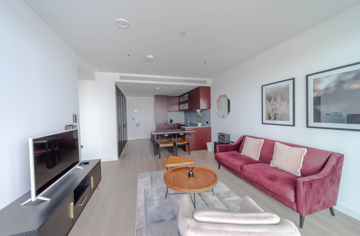 Entire flat. Stunning quiet 1 bedroom (sleeps 2 sharing) riverside apartment with balcony in Battersea / Clapham Junction (Zone 2) / Wandsworth ; 10 minutes walk to Station. 25 minutes from Gatwick Airport to Clapham Junction. 100 metres from St Mary's Wandsworth Pier (RB6 Uber Boat river service to Central London). Buses to Victoria 24/7 in front of building. Close to all amenities. 24 hour concierge for check in/out. Please note the living area does not have a sofa bed/linen provided.