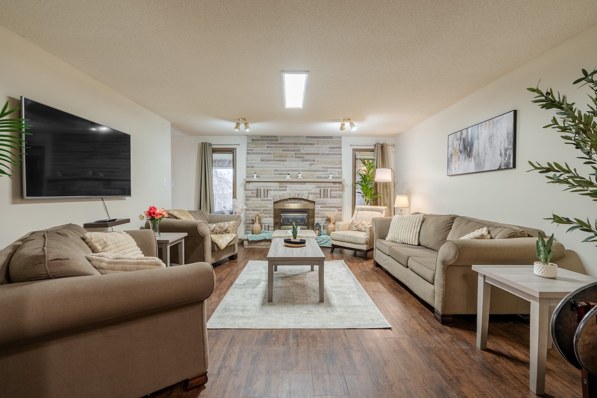 Welcome to our retreat in west London! This stylish Two-Level Basement Split is a guest suite ideal for friends and families. Our 1+Den has 2 comfy Queen Beds, 1.5 bathrooms, a large kitchenette with every appliance you need, and a foosball table for some competitive fun. Outside, there's a hot tub, firepit (BYO wood), BBQ, and outdoor eating area. We live upstairs and are available to assist with the indoor or outdoor amenities at any time!