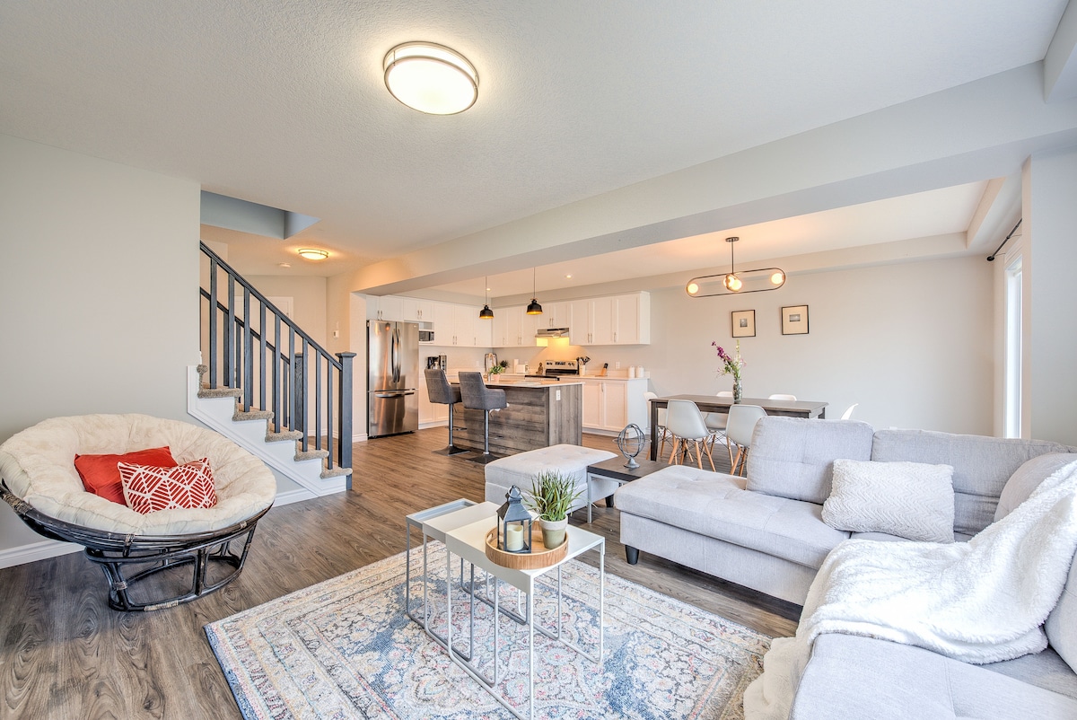 Welcome to your serene retreat! This modern townhouse offers an open-concept layout, three bedrooms, a brand-new kitchen with sleek appliances and a private deck. Stay productive with a dedicated workspace and enjoy convenient amenities like a washer, dryer, free wifi, Bell Fibe TV and more. Just 4 minutes from The Doug Tarry Complex & 8 minutes from the Joe Thornton Community Centre. Book now for unforgettable memories!
