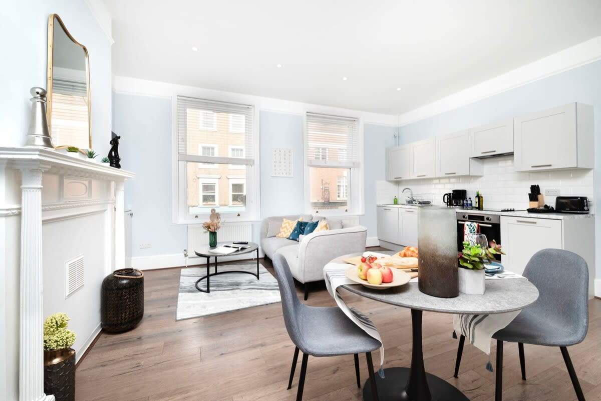 Embark on a serene retreat in the heart of bustling Fitzrovia, London at our quaint abode. - One-bedroom, one-bath sanctuary perfect for solo adventurers or couples. - Cozy interior with a plush couch and flat-screen TV. - Open-plan kitchen with necessary utensils and dining area. - Double-sized bed with fresh linen for restful sleep. - Ensuite bath with walk-in shower for refreshing after urban exploration. Your London story, steeped in comfort and convenience, begins here.