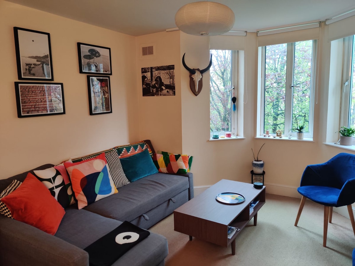 Recently redecorated colourful Bauhaus inspired modern home of British Sculptor with mid-century and modern furniture and decoration. There is a pretty back bedroom overlooking a communal garden. This is a top floor flat in a small development of 3 floors - full of contemporary art collected over years of travelling. The property is ideal for travellers and couples and families looking to explore London.