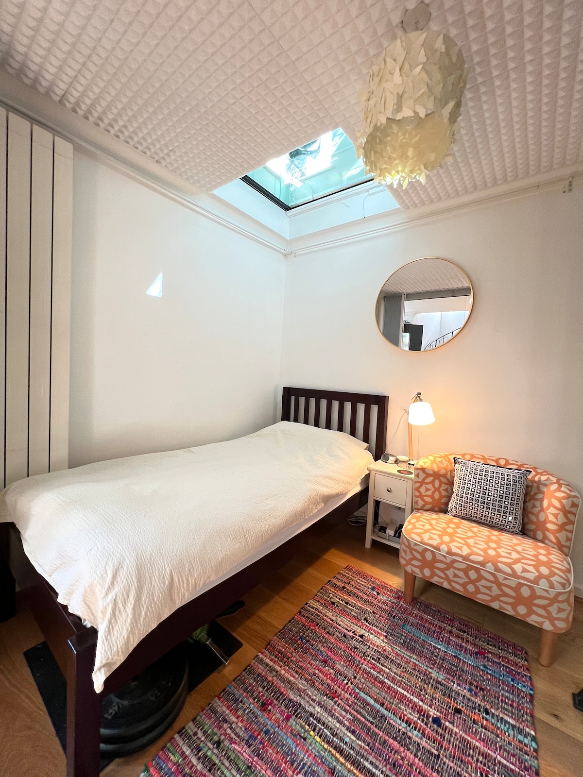 A cosy 2 bedroom apartment with a parents' double room (sleeps 2) + separate children's mezzanine room (sleeps 3) and a large sheltered roof garden. Natural light pours into the triple aspect and double height sitting room with great views over Battersea Square. Located on the riverside 8 min walk from fashionable Kings Rd, Chelsea + 5 min from Battersea Park. City centre (Buckingham Palace) 15 min by bus departing 50m from apt. door every 8 min.