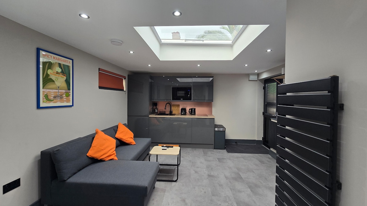 Welcome to Skylight Studio, a stylish, high-spec retreat just minutes from Wembley Stadium. Sleeps up to 3 with a plush king bed and sofa bed. Enjoy private access, sleek interiors, ambient lighting, and a fully equipped kitchen. Ideal for event-goers, business travellers, and city explorers. Permit parking available. Book your stay in this beautifully crafted space where comfort, convenience, and design meet in perfect harmony.
