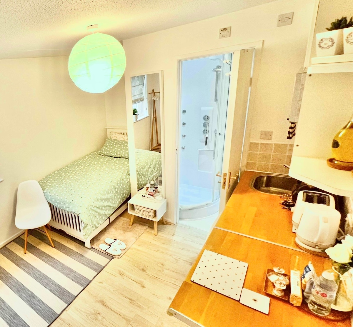 The Acorn is on the southern side of Bishops Stortford, roughly 15 minute walk from town centre. There is a river behind you can stroll along, outdoor space, and the room is light and airy. Private gated parking for one vehicle. The place is secluded good for couples, solo adventurers, business travelers, and one well-behaved furry friend (pet). (Please note that the hosts live 15 mins away & not next door). With transport links nearby (bus, train, Stansted airport), the adventure starts here!