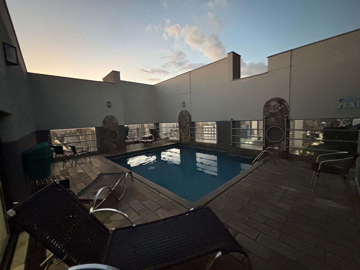 FLAT TIPO LOFT Espaço completo com 43 m2, o dobro dos hoteis, com garagem grátis. Flat 5 estrelas dentro de um hotel 4 estrelas, com uso grátis de piscina, sauna, academia, salão de jogos, recepção 24 horas, sala de espera e serviços pagos como café da manha , restaurante e room service, tudo com segurança. À 400 m do centro, perto de supermercados, farmácias, teatro, restaurantes. Consulte nos aplicativos as disponibilidades dos flats 702, 901,902, 1002 e 1003. Temático Londres. Tudo novo.
