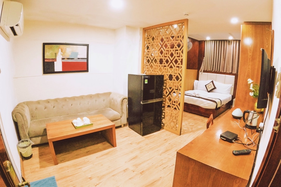 **LOCATION: Minh Thien hotel is located near the center of the city. It just takes about 3 minutes to come Bui Vien Street, 5 minutes to come Ben Thanh market and 7 minutes to come Nguyen Hue Walk Street. Address: 71/18 Nguyen Trai street, Ben Thanh ward, distric 1, Ho Chi Minh city, Vietnam. • Equipment: TV, mini fridge, air-condition, wardrobe, hot and cold Shower equipment, cell phone, makeup table, love chair…