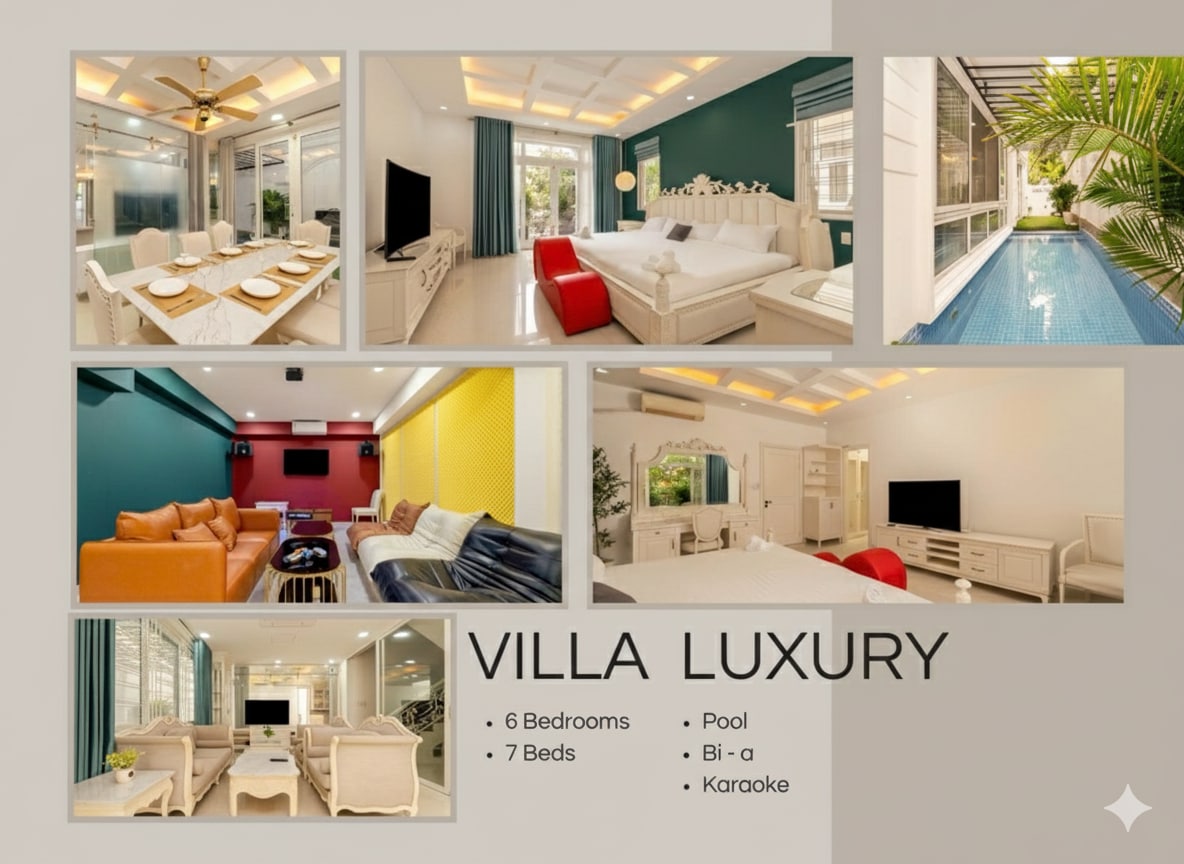 Biệt thự sang trọng tại Quận 2 – Trải nghiệm nghỉ dưỡng đẳng cấp Tọa lạc tại trung tâm Quận 2, TP.HCM, biệt thự 6 phòng ngủ, 7 giường và 5 phòng tắm là lựa chọn hoàn hảo cho gia đình hoặc nhóm bạn. Villa có hồ bơi có chế độ sục massage, sân vườn xanh mát, phòng karaoke, bàn bi-a, khu BBQ ngoài trời. Thiết kế hiện đại, nội thất cao cấp, mang đến không gian nghỉ dưỡng riêng tư, tiện nghi chuẩn resort.