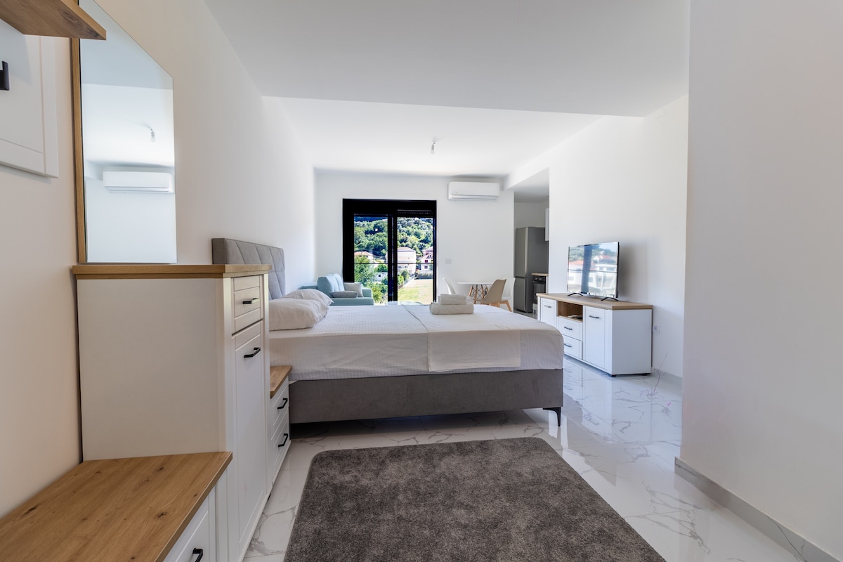 This year 2019 we renovated complete apartment. It's modern fully new equipped. Apartment with a beatiful view on swimming pool (open from 15.05-15.10) , olive trees and the sea. We are about one and a half hour far from Podgorica and Tivat airports- 65km. We have free wifi, parking,AC,and satellite tv programe.Optional breakfast, optional rent a car and transfer to airport. Our place is very quiet & relaxing, it is near to centre.