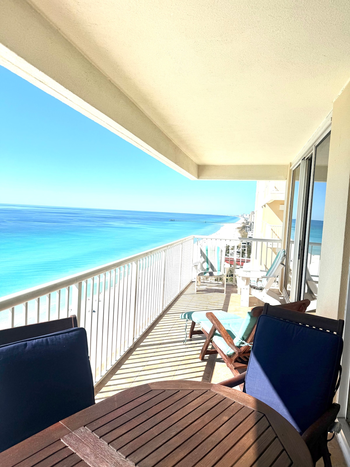 SPECTACULAR GULF-FRONT MASTER ! Amazing Westend Resort and RIGHT ON THE BEACH! Gulf Front Master with 30’ wide 160sqft PRIVATE balcony accessible from master & living area! Streaming 65" 4K TV plus 55” 4k in bdrms, fast Encrypted WiFi , tastefully decorated with “Beachy” feel fresh updates. This comfy getaway has 9’ tall sliders to view the Emerald Coast - pictures can’t do justice. Private bunk room, new sleeper. private beach & every amenity. Walk to Pier Park. Close to airport. It’s perfect!