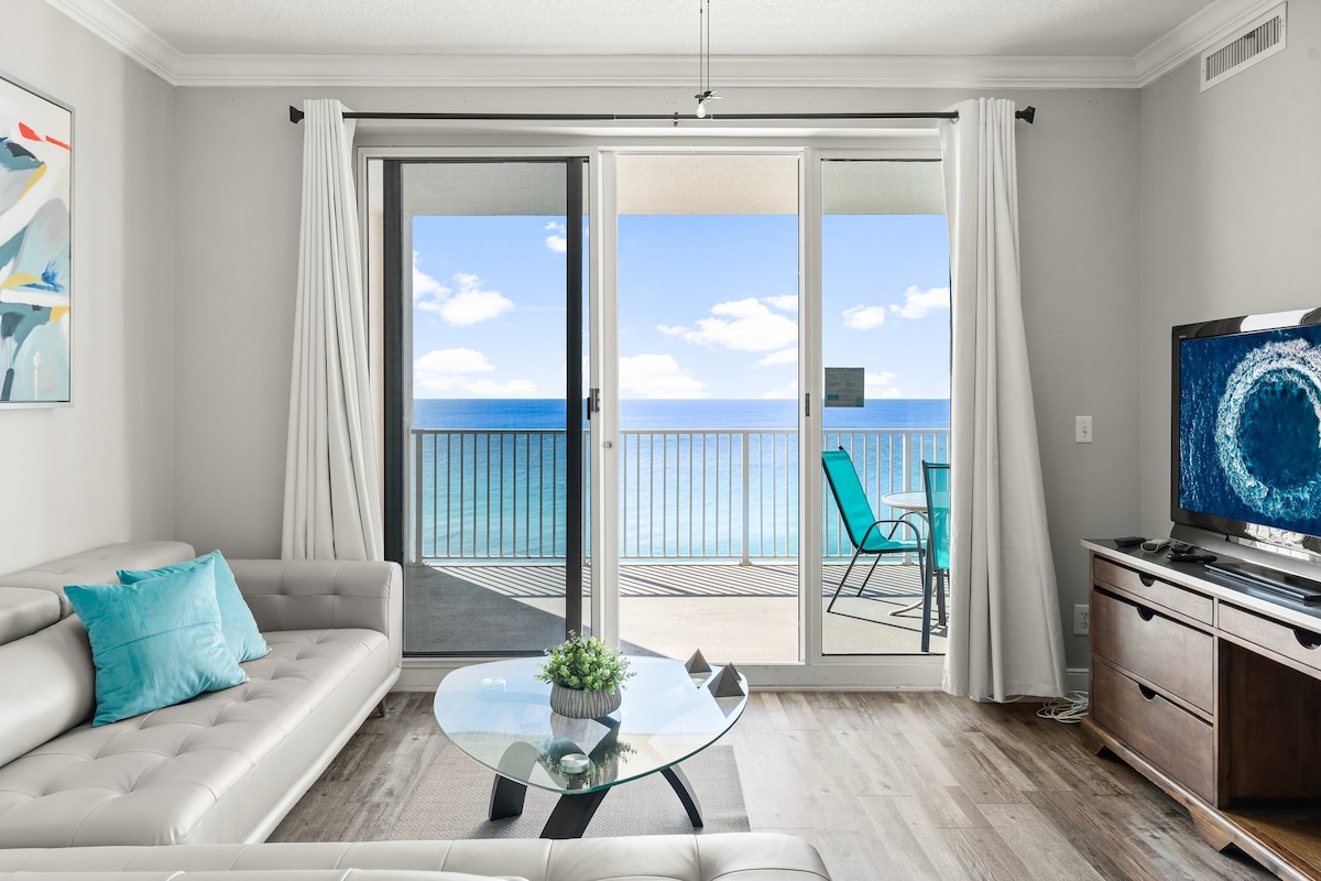 This GULF FRONT BEACH condo has a style all its own. Long Beach is a gated community and features the longest stretch of sand in PCB. This newly renovated condominium on the 7th floor has panoramic views of the Gulf from every room . Spanish-style ceramic tile floors & premium granite countertops throughout. The huge curved balcony attracts spectacular sunsets. The resort has low occupancy so the super-fast elevators won't leave you waiting. The resort has a 25 yo age minimum in order to book.
