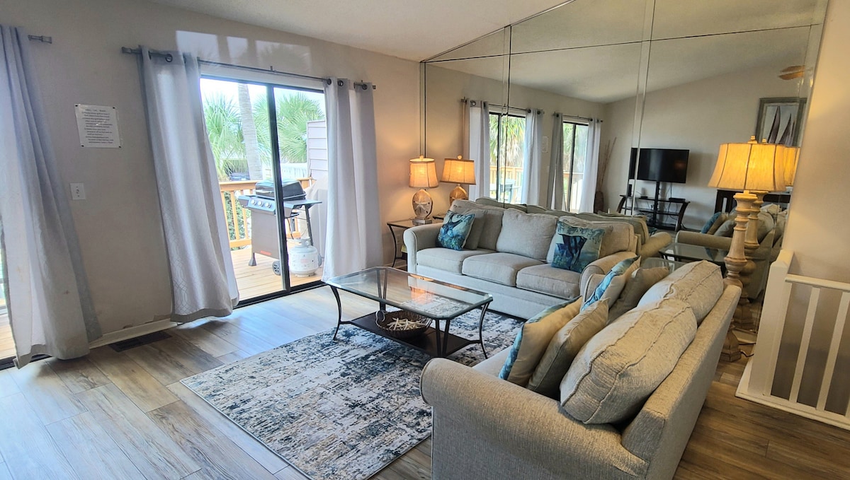 3 minute walk to the beach! Mostly newly renovated, 2 br 2.5 bath. Sleeps 6 Townhouse located in a gated community with 11 pools (5 heated) one pool located on the beach! shuffleboard, 4 tennis courts, gym, and 2 acres of mini golf. Golf cart rentals aval, We are centrally located to the areas main attractions and restaurants. Just a quick walk across the street from the beach. 2 numbered parking spaces right outside of the unit. Fully stocked kitchen with coffee/Keurig maker,Espresso machine.