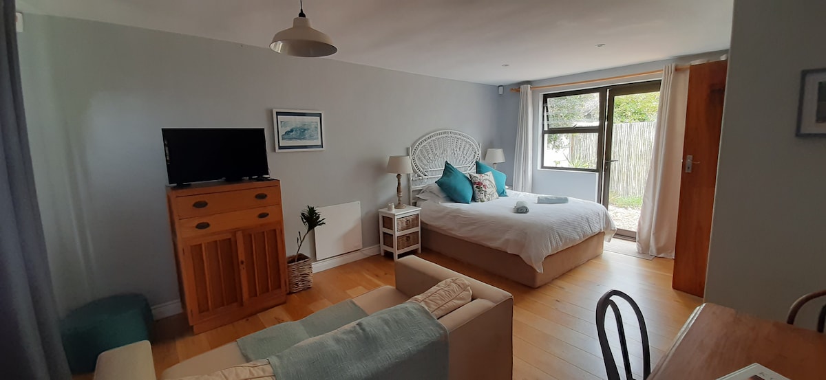 It comprises a double bedroom with French doors leading onto private gravel patio with sea and mountain views and breakfast table shade by tall proteas, bathroom with bath and shower tiled in travertine (also mountain views!), lounge with kitchenette and covered "sundowner" patio with magnificent sea views.