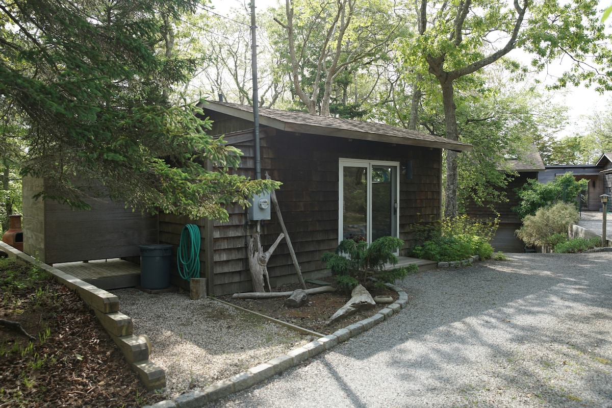 A little cabin on our property in Hither Woods. A cozy hideaway conveniently located 12 minutes walk from Gurney's Beach Resort, 16 minute walk from public path to beach, and 6 minutes drive from Montauk town for restaurants and nightlife. Good for couples and solo adventurers, the space is private and homey, with outdoor shower and Chimenea fire pit. The main house is 65ft away, but we honor your privacy. The cottage comes with WiFi, window A/C and complimentary coffee or tea. Parking for 1 car