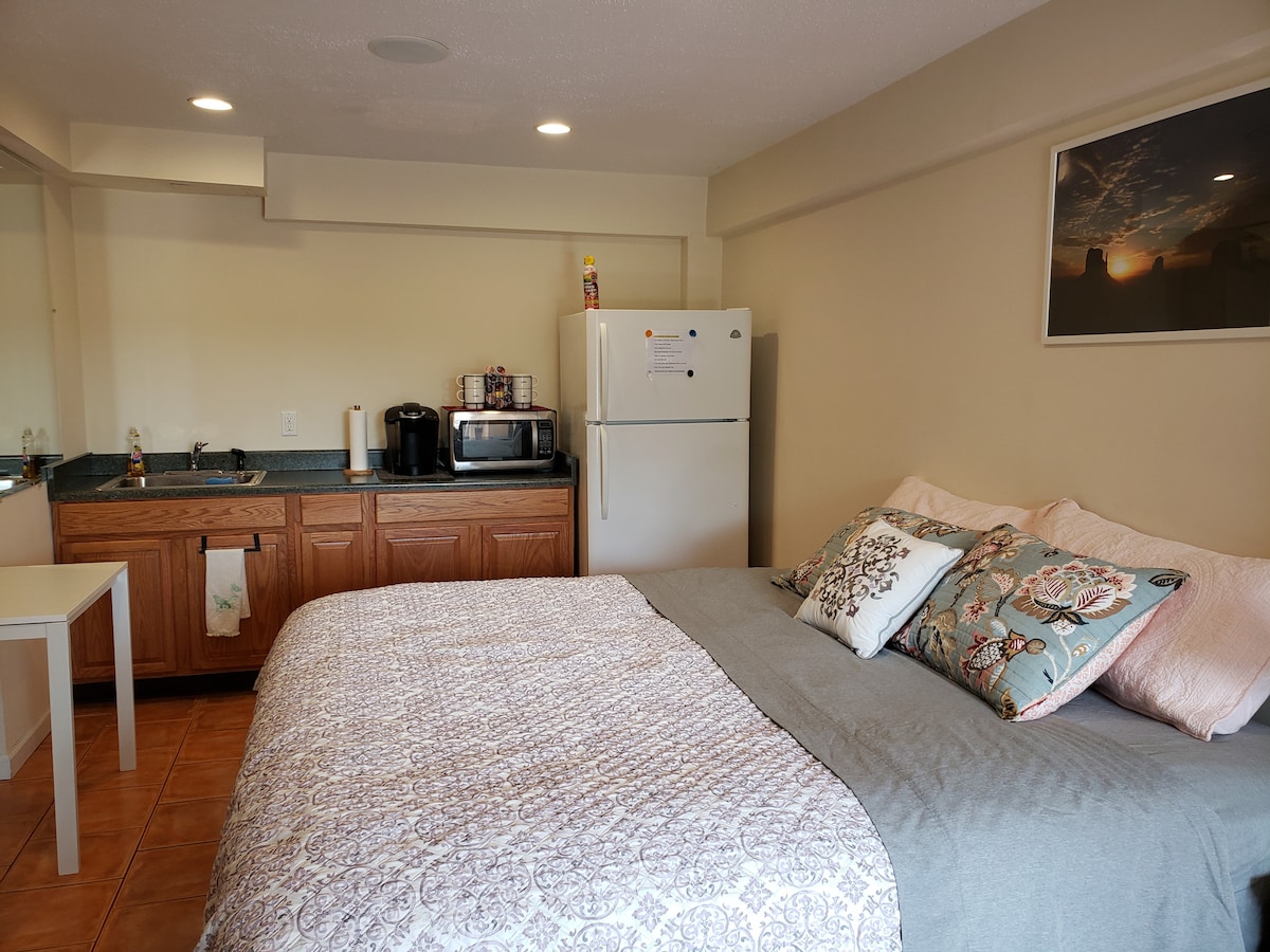 Perfect for solo travelers or couples.This new, cozy studio is part of a larger home but fully self-contained w/ its own entrance. Inside, you’ll find: - A comfy living area with a pull-out twin bed and seating - A kitchen with essentials for light cooking - A private bathroom with shower, towels, and toiletries - High-speed Wi-Fi and a flat-screen TV Though attached to our home, your space is private. Located in a quiet neighborhood, close to attractions, restaurants, and transportation.