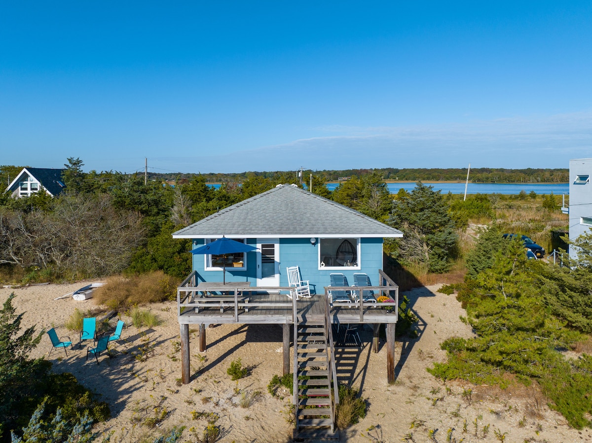 This newly remodeled 1960’s bungalow is the perfect getaway for couples and families alike. Located right on Gardiner’s Bay, there’s a gorgeous view of the water from the large windows and front porch. From the front steps you can follow the 300 yard path to your own private beach where you can wade, swim, snorkel, paddleboard, or just enjoy the amazing view and salt air. (East Hampton Rental Registry Certificate Number: 24-234)