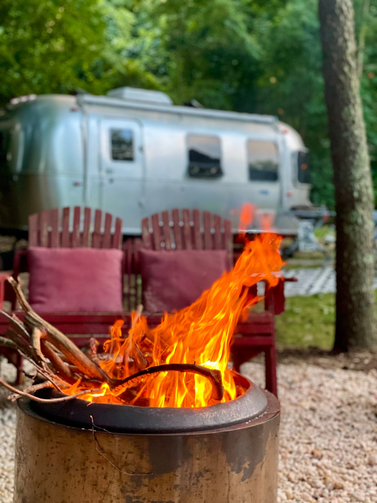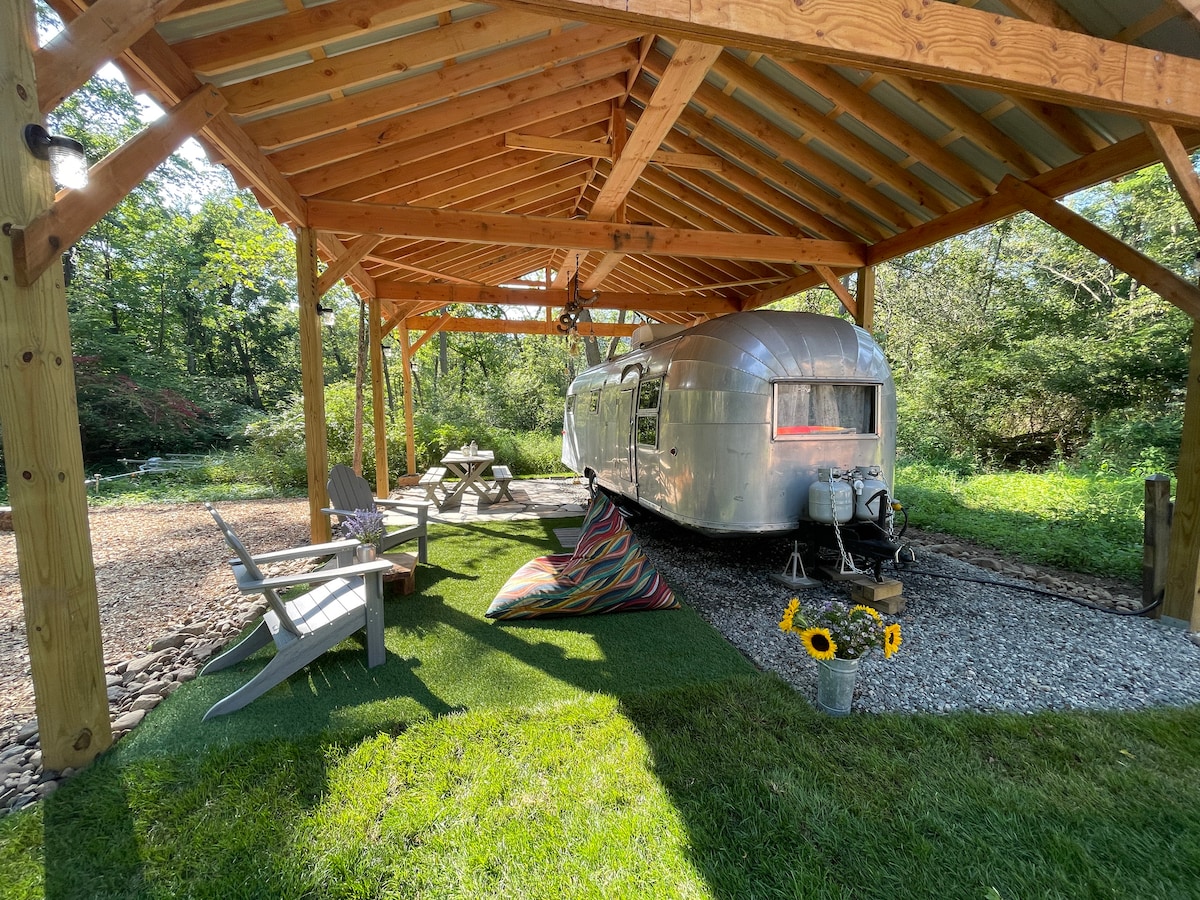 Just 40 minutes north of NYC on the edge of Harriman State Park this unique, fully restored, 1954 Airstream is equipped with all the functionality of the modern world. Perched beside a stream and under a purposely built pavilion the Airstream dream comes alive with its own patio, BBQ, fire pit, and charming barn. From Memorial Day to Labor Day, enjoy shared access to our heated saltwater pool—perfect after a day of hiking. Towels provided.