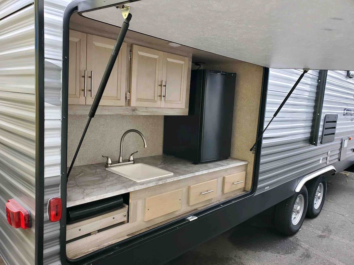 Our 29 foot Coachman Catalina will make your stay unforgettable. With both an indoor and outdoor kitchen with 4 burner stove, microwave, full refrigerator and gas grill. Meal prep will be a breeze, inside or out. With indoor and outdoor speakers and a 40 inch flat screen TV you will be able to enjoy some music with dinner and a family movie night.