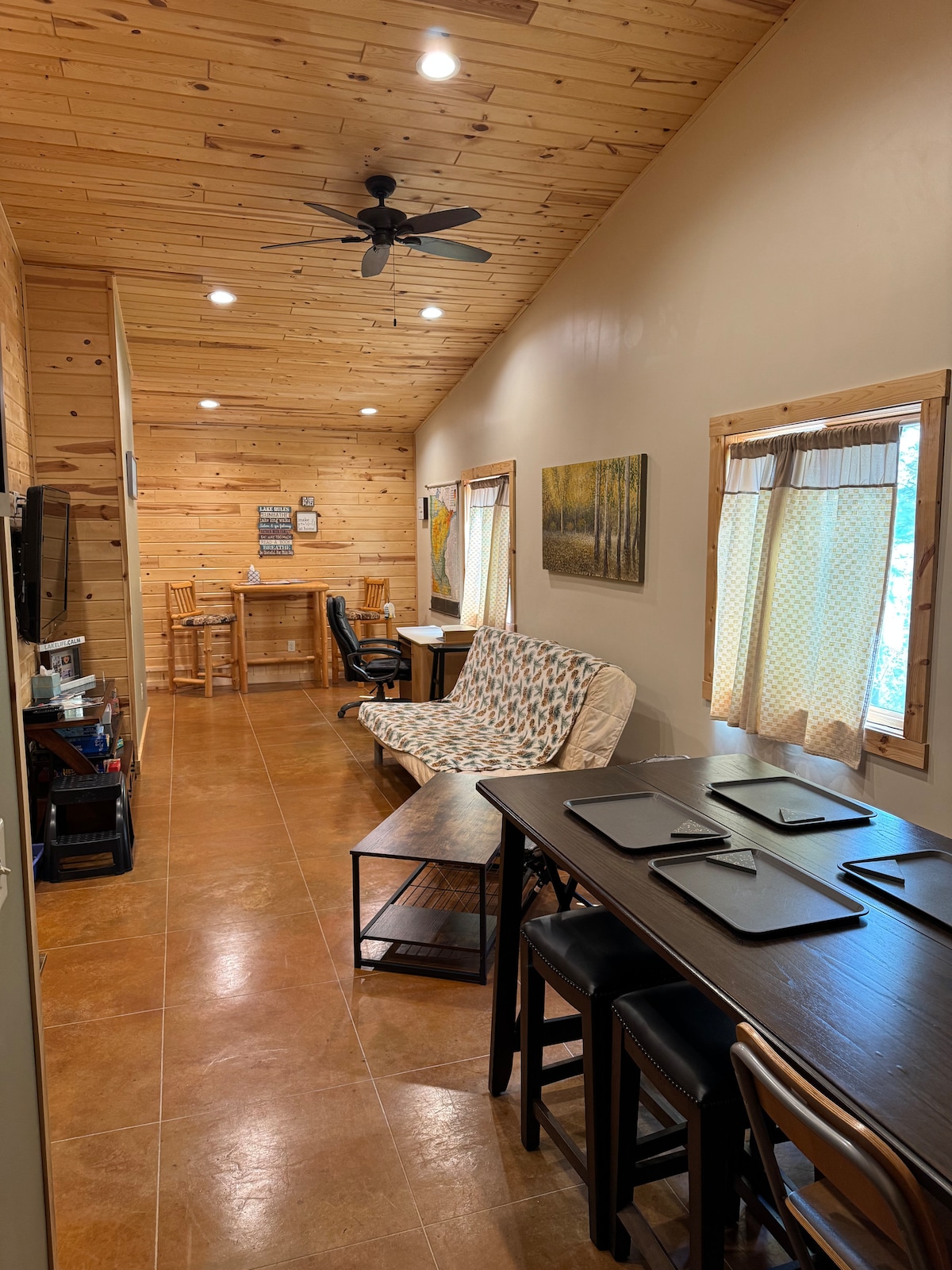 Escape to this tiny cabin and enjoy views of Bass Lake and a small pond that surrounds the property. This modern cabin sits up high on a hill and overlooks the water. Surrounded by nature, you will get a true sense of serenity. Catch the lovely sunrise in the morning. Inside, the space comfortably sleeps 3 with one private queen bedroom and a daybed in the main area. Not to mention, a full kitchen, bathroom, and cozy breakfast nook. Kick back and relax in this calm, minimalist space.
