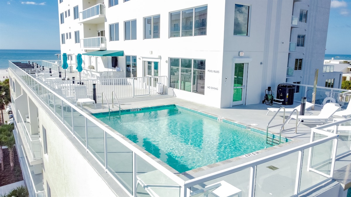 The most stunning views from this brand new condo directly on Treasure Island Beach. This lovely unit is on the 4th, 5th, or 6th floor and provides sweeping views of the ocean. This units has 2 bedrooms and 2 full bathrooms. The inviting open concept living area has one of the best views of the ocean, especially when the retractable sliding doors are opened. The dining table on your private balcony provides a perfect dining area, with the ocean providing a beautiful backdrop.