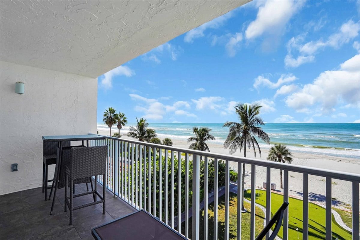 Beachfront Bliss — No Streets to Cross, Just Steps from the Sand! Enjoy breathtaking Gulf and sunset views from your private balcony in this spacious, newly updated condo. Featuring a brand-new bathroom and new flooring throughout, this 4th-floor unit (with elevator access) is the perfect retreat for your Longboat Key escape. The condo comfortably sleeps up to 6 guests. Sip your morning coffee or catch dolphin sightings and stunning sunsets from the balcony with 180° view of the Gulf. Elevator.