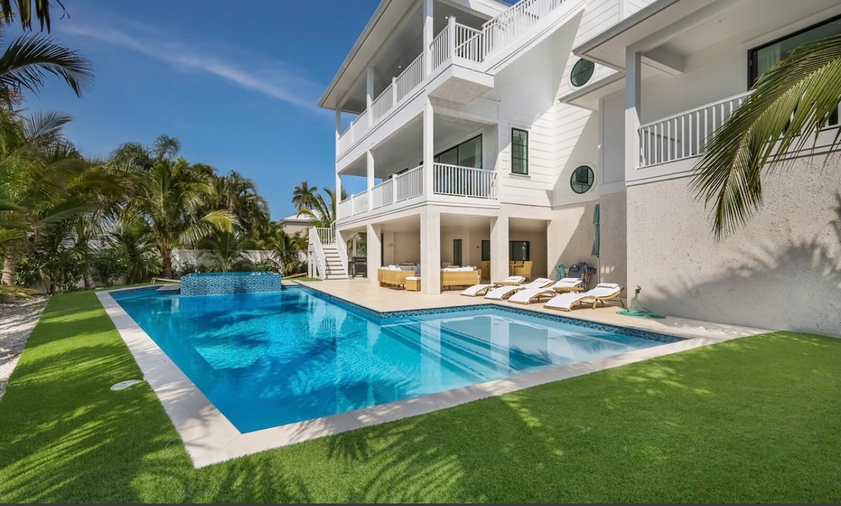 Luxurious waterfront home with bay and and canal view, new custom kitchen with a view to the pool and your own private tiki bar, dock that can accommodate up to 21 ft boat , whole house just received a complete inside and out make over. Tropical coconut palms, outside patio and grill. Fish on the dock and watch dolphins and manatee. Truly a tropical paradise just 7 minute Walk to your own private beach. minutes from St Armand’s circle. feel free to reach out with any questions or requests