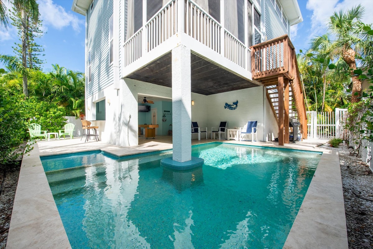 Escape to The Funky Fish House! Your private 2BR/3BD/2BA tropical oasis boasts a heated saltwater pool, bubbling hot tub, outdoor shower, and BBQ grill for endless fun, relaxation, and sun-soaked adventures. Just 5 miles from world-famous Siesta Key Beach and steps from Trader Joe’s, this elegantly renovated, fully stocked, stylish retreat invites families or couples to lounge, entertain, soak up the Florida sunshine, and enjoy the ultimate Sarasota vacation in absolute comfort and style!