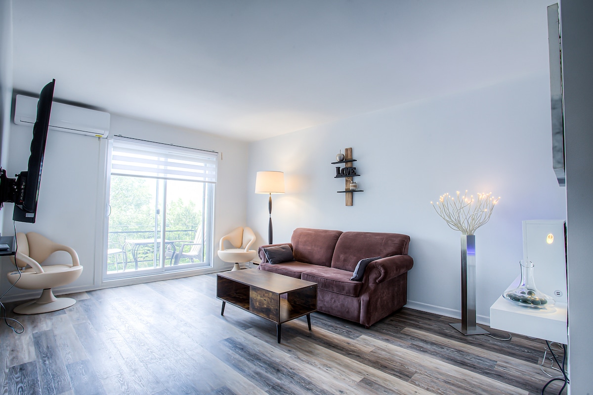 Bathe in the elegance of this exceptional accommodation. New apartment with appliances included, fireplace, granite, filtered water, ice. The apartment contains 1 large bed in the bedroom and 1 large sofa bed for two people in the living room. Healthy and hygienic, modern condo, hotel style, equipped with everything you need for your vacation. The condo has a separate entrance, the door is provided with a code. It is on the first floor, sunny, with a view of the park.