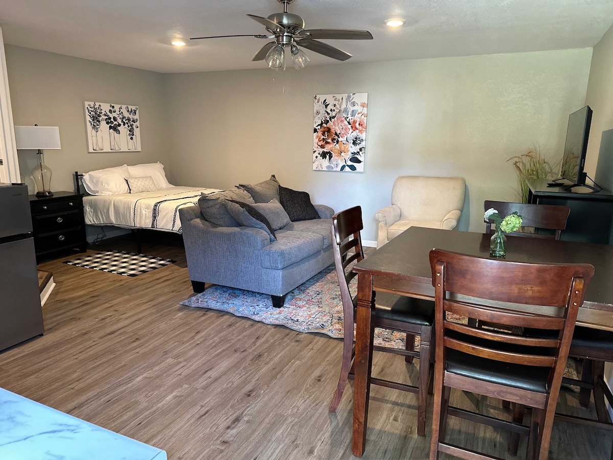 This is a 552sqft apartment within our home. It has a completely private driveway and entrance and secure locking interior door between units. One of the features we think you'll most enjoy is the spacious shower with all the hot water you could want! The kitchenette is ready for a bit of cooking if you like. In addition to the King bed, the sofa folds into a bed suitable for an older child or young adult, and a twin mattress on the floor is available upon request.