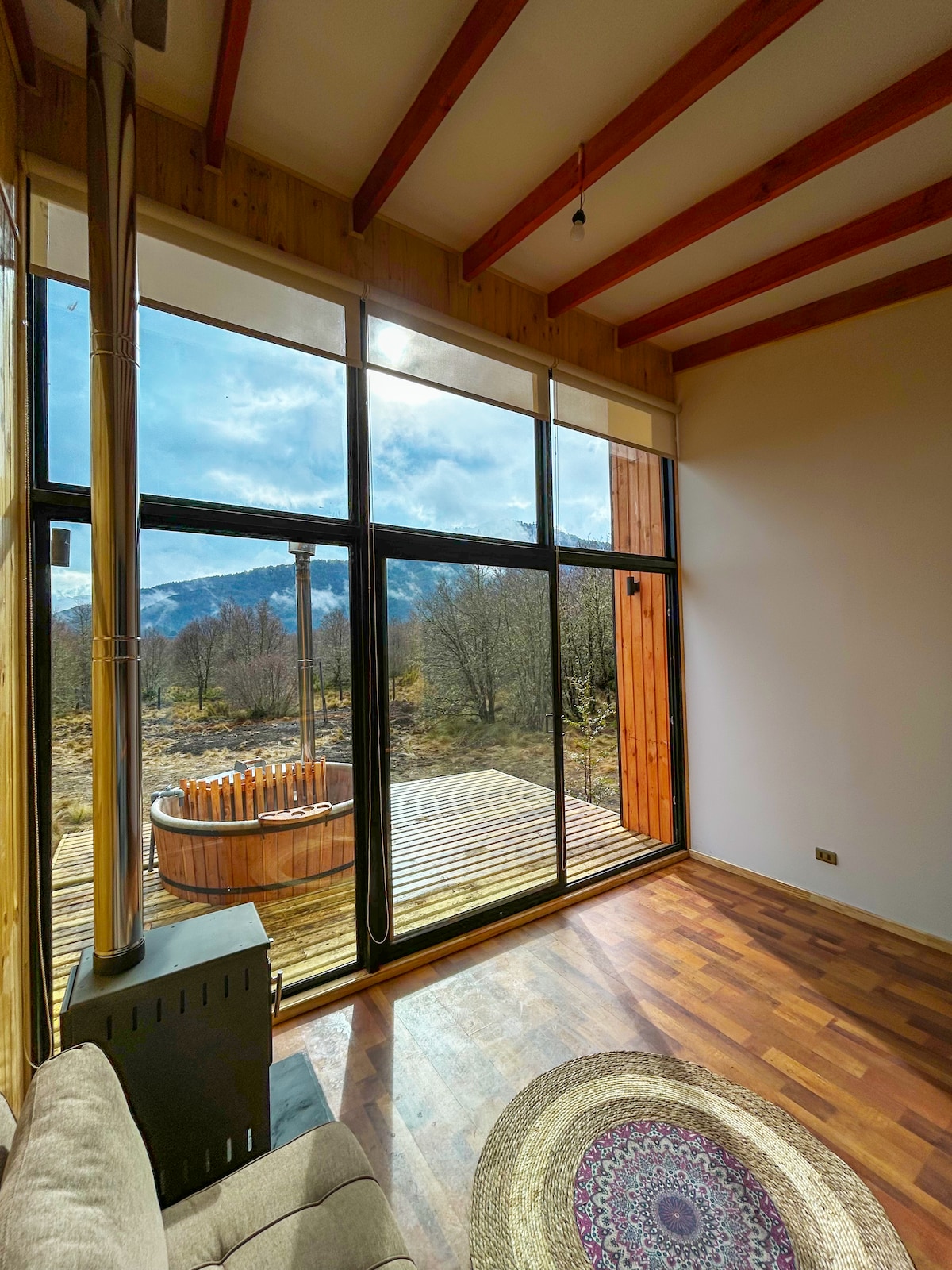 Cabaña para 2 personas, Incluye bicicletas MTB de paseo y opción a tinaja caliente privada ($40.000 adicional). Tiene una espectacular vista al Volcán Llaima y el lugar está rodeado por un bosque precordillerano. El Parque Nacional Conguillio se encuentra a 8 km. Por el lugar pasa el río Captren y se encuentran Los senderos de la Laguna Negra, geositios que forman parte del geoparque KutralKura. También cerca está el centro de esquí, reservas naturales, ciclovías, termas y saltos de agua.
