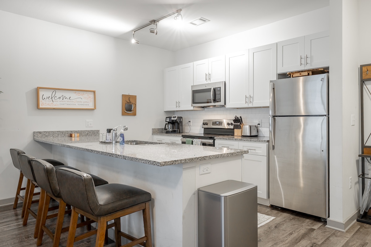 Retreat from your Chattanooga adventures to our downtown condo with comfortable furnishings, homey touches, and a corner for the kids with books and toys. Order in and watch Netflix on the couch or cook a family meal in the fully-equipped kitchen (kids' dinnerware included). Perfect for a family, two couples, or small group of friends, the condo has a shared gym, pool, & fire pit. This is the perfect base camp to check out all that Chattanooga has to offer!
