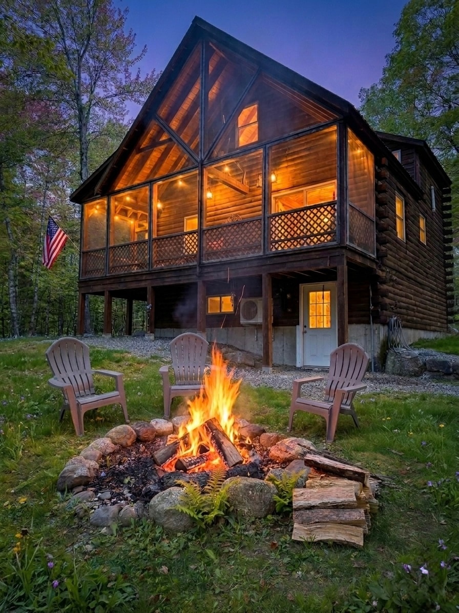 A real cabin in the North Woods secluded, private, and surrounded by open sky and sweeping mountain views that remind you why you came. This log-style retreat sits deep in the woods above Tamworth, fully equipped for comfort without sacrificing the rugged feel. Hike local trails, stargaze in near-zero light pollution, or sit by the fire pit with the mountains in front of you. The optional wood-fired sauna steps from the door is the perfect end to the day. Sauna available as a one-time add-on.