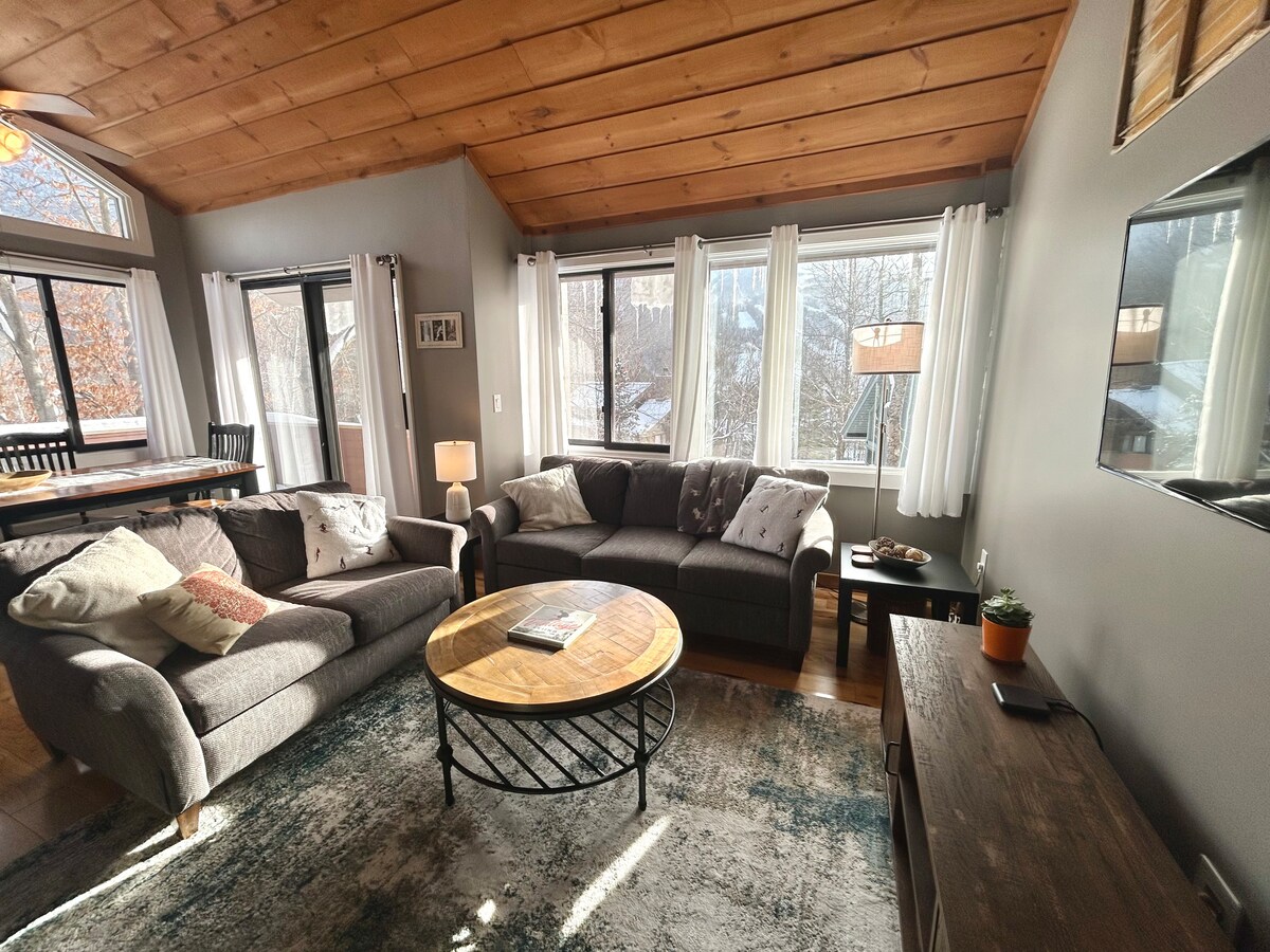 Modern 3 bedroom, 2.5 bathroom townhome across from Loon Mountain with the ski shuttle conveniently outside your door. Renovated with high-end finishes, luxury appliances, and cozy spaces for guests to relax. Refined, comfortable, and family-friendly, this 4 season retreat offers easy access to skiing, hiking, biking, and stunning mountain views. *Access to sauna, hot tub, indoor/outdoor pools, gym *Swim/Tennis Club passes included *Games room *Office + fast Wifi for remote work *Parking onsite