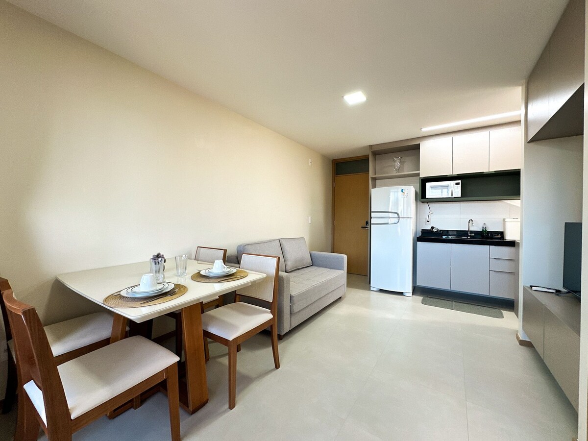 Apartamento para até 4 pessoas. Sala com sofá-cama queen, tv a cabo com, netflix, wi-fi. Suite c/ 1 cama de casal e ar condicionado. Roupas de cama e banho disponibilizadas . Cozinha completa. Aproveitem este espaço idealizado para transformar suas férias na praia, em férias dos seus sonhos! A vista de tirar o fôlego, a brisa que te acalma, unindo a tudo isto, todo o conforto de um apartamento funcional e cheio de boas energias! Venha viver esta magia , aguardo vocês!