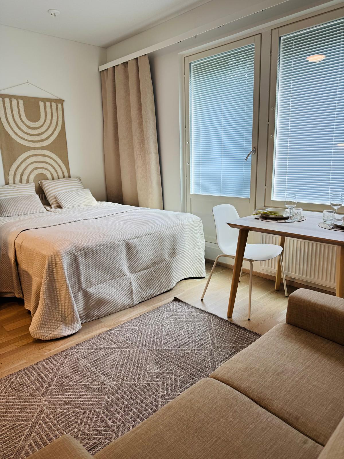 Winter Dream Suite – Luxury and Relaxation Near the City Center This high-quality and spotless apartment accommodates up to four guests and features a private sauna and a cozy balcony. The location is perfect: a peaceful setting ensures restful nights, yet the city center with its services and attractions is just a short walk away. Scandinavian style 2nd floor apartment has a large living room, alcove with queen size bed, sauna and furnished balcony. Fully equipped kitchen.