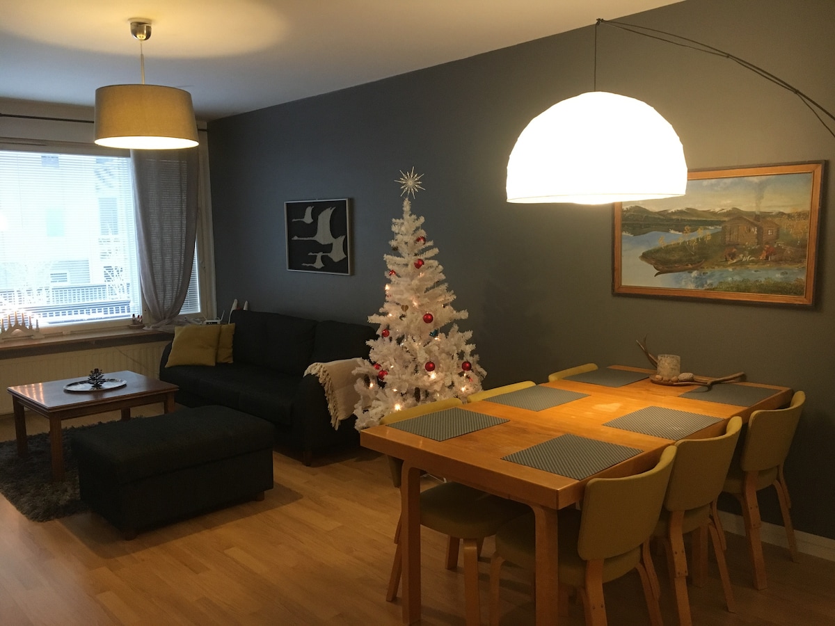 Fully-equipped modern apartment for a pleasant stay in Rovaniemi winter wonderland. ❆ 56 m² stylish apartment ❆ All the modern facilities and fully furnished kitchen ❆ Private balcony ❆ Free parking ❆ Great location next to city center. Safari offices, city center restaurants, cafeterias and shops are only 5 minutes walk away ❆ Bus stop to Santa's Village only 4 minutes walk away ❆ Next to a beautiful river side walk