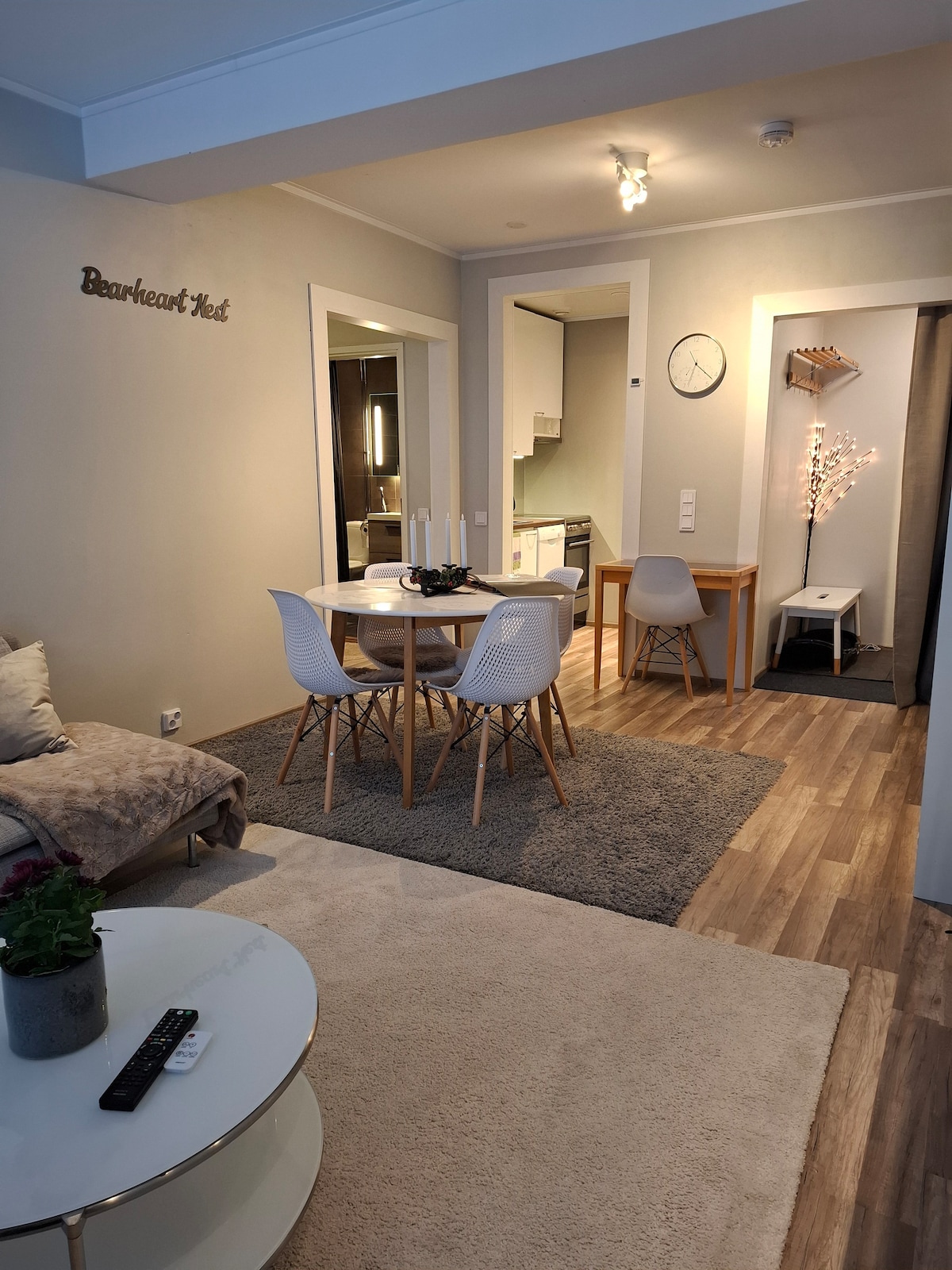 Relax in your private sauna in this fully renovated, modern apartment in the center. ★ "...clean, modern and beautifully decorated. Highly recommended!" ☞ Sauna & free parking. ☞ Fully equipped + stocked kitchen ☞ 65” Smart-TV & 500 MB wifi. ☞ Fully renovated. 》2min walk to shopping, restaurants, and arctic tours. 》3min walk to airport/Santa Claus shuttle bus. 》11min drive to Santa Claus Village and to ✈ airport 55m2 stylish home on the 1st floor –> no elevator. Book now before it’s gone!