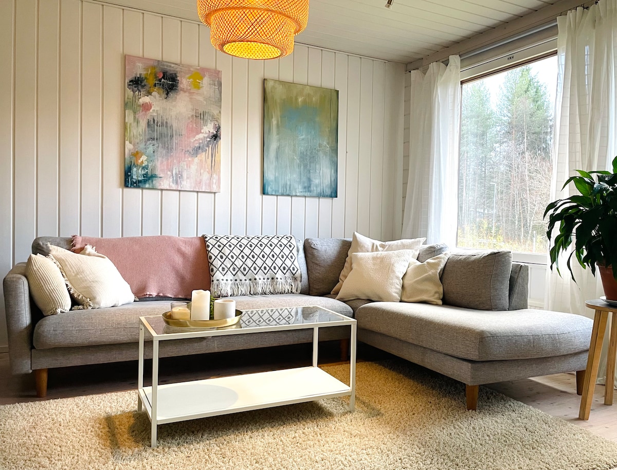 Relax in your private sauna in this fully renovated, modern apartment in the center. ★ "...clean, modern and beautifully decorated. Highly recommended!" ☞ Sauna & free parking. ☞ Fully equipped + stocked kitchen ☞ 65” Smart-TV & 500 MB wifi. ☞ Fully renovated. 》2min walk to shopping, restaurants, and arctic tours. 》3min walk to airport/Santa Claus shuttle bus. 》11min drive to Santa Claus Village and to ✈ airport 55m2 stylish home on the 1st floor –> no elevator. Book now before it’s gone!
