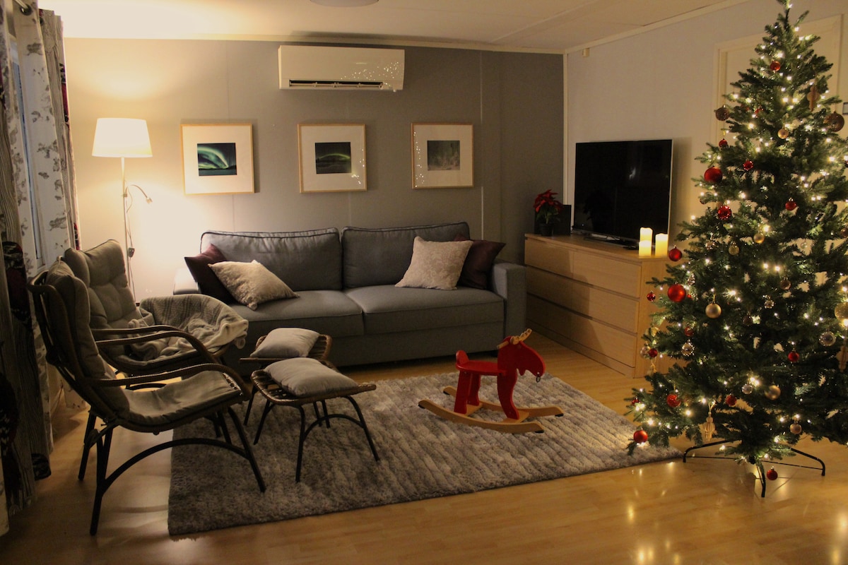 Welcome to enjoy your holiday in Rovaniemi and be our guest. Cozy 50m2 apartment of a familyhouse by a river: Kitchen, livingroom with sleeping loft, bathroom, balcony, underground sauna and jacuzzi (extra price), barbecue and parking place. There are four beds (one double and two singles) and if necessary baby's bed. Apartment is located in a peacefull familyhouse area and it takes 5 min drive and 20 min walk to city center. Supermarket is very close also (2 min drive and 10 min walk).