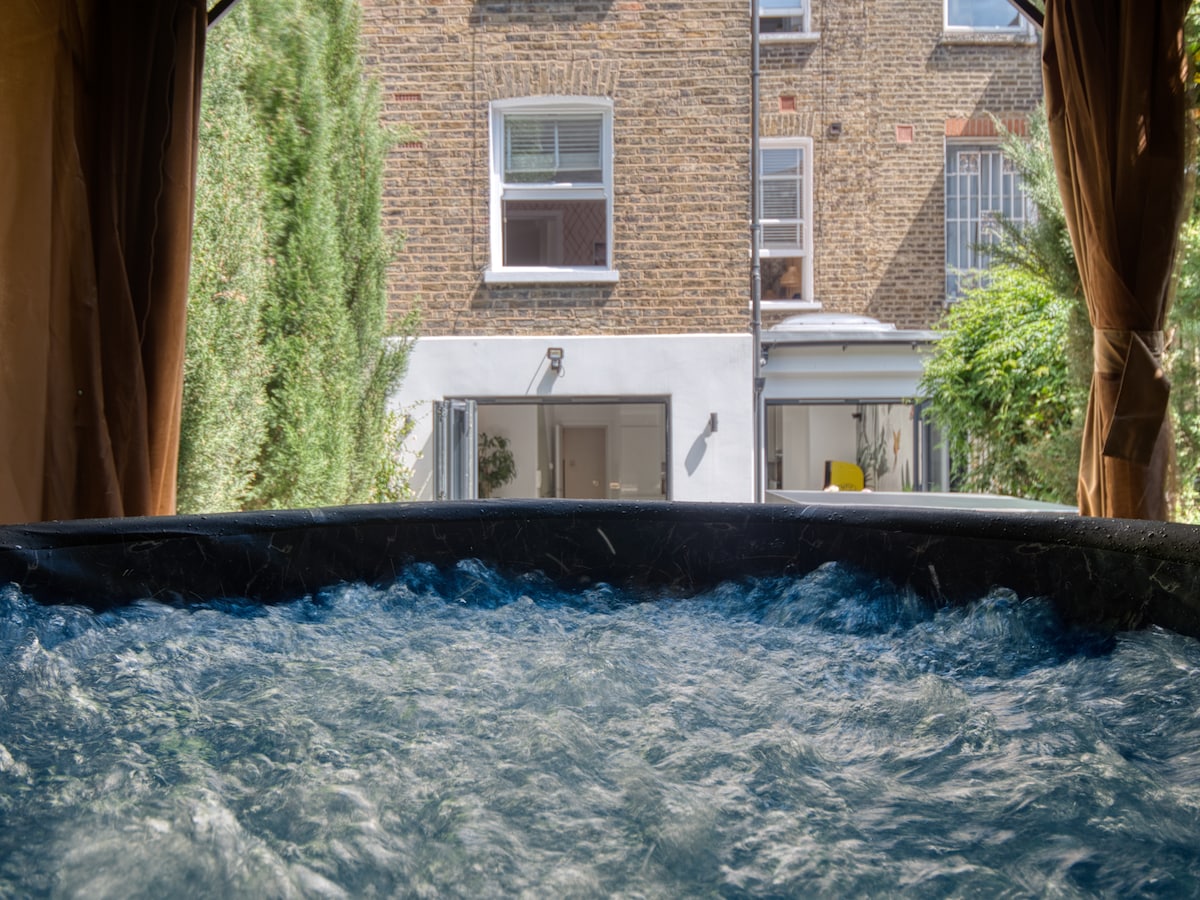 ✺ Perfect for professionals & leisure travellers ✺ Private, tranquil Hot Tub ✺ Self check-in ✺ Home Cinema with 85" TV, Netflix, PS5 & Sonos ✺ Pac-Man arcade machine & football table Unique premium designer home in Central London. Easy access to all tourist attractions. Short walk to Queen's Park & Westbourne Park tube stations. Our retreat offers luxurious tropical ZEN decor, hot tub, 3 full size bedrooms, 2 high spec bathrooms, underfloor heating, gaming room & home cinema.
