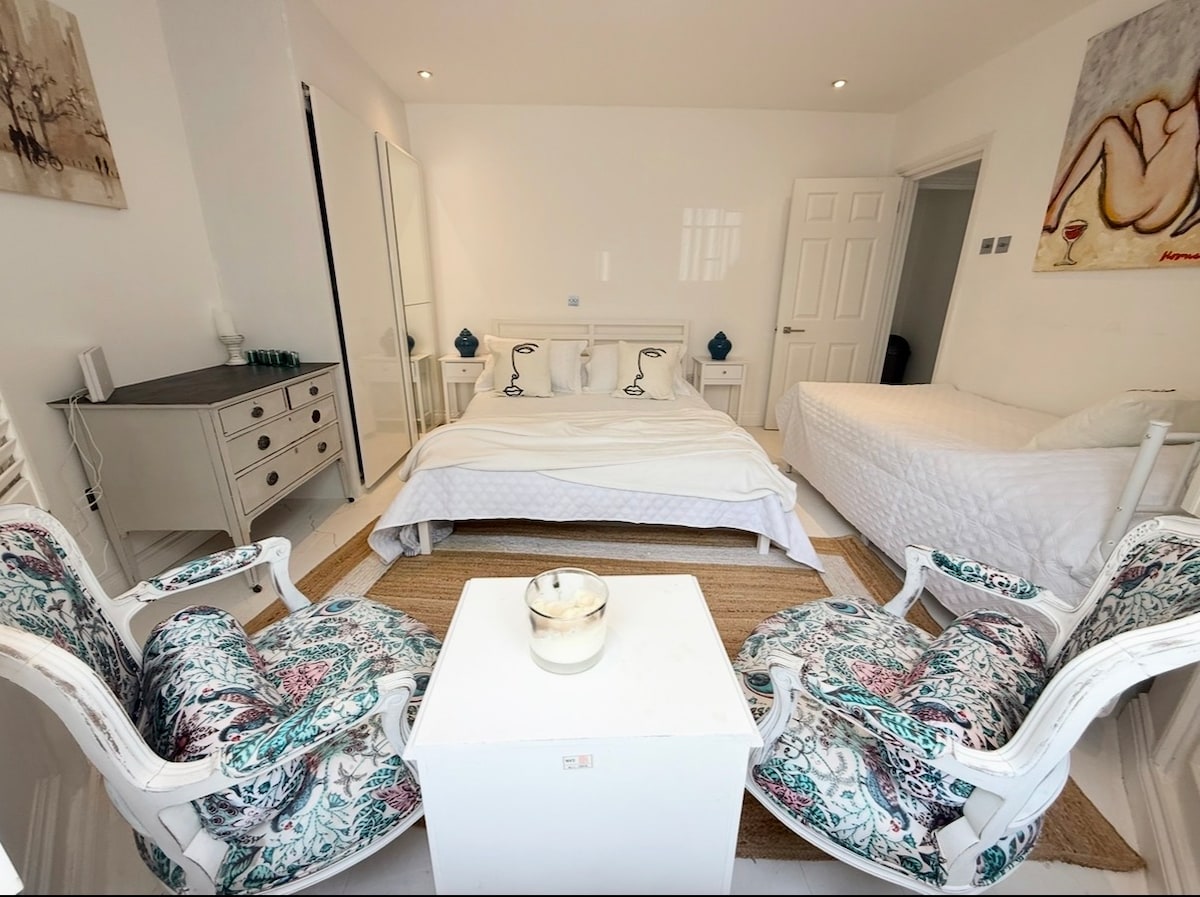 A beautiful self-contained garden studio, located in the heart of historic Highgate Village. The 320 sq foot studio is equipped with King size bed, kitchenette, Bathroom with spacious shower, 55” HDTV, BBC iPlayer, Amazon & Netflix. There is a semi-private outside patio with seating. The village has ten pubs/restaurants within a few minutes walking distance, along with the beautiful expansive Hampstead Heath and Highgate Cemetery. With excellent bus and tube transport connections close by.