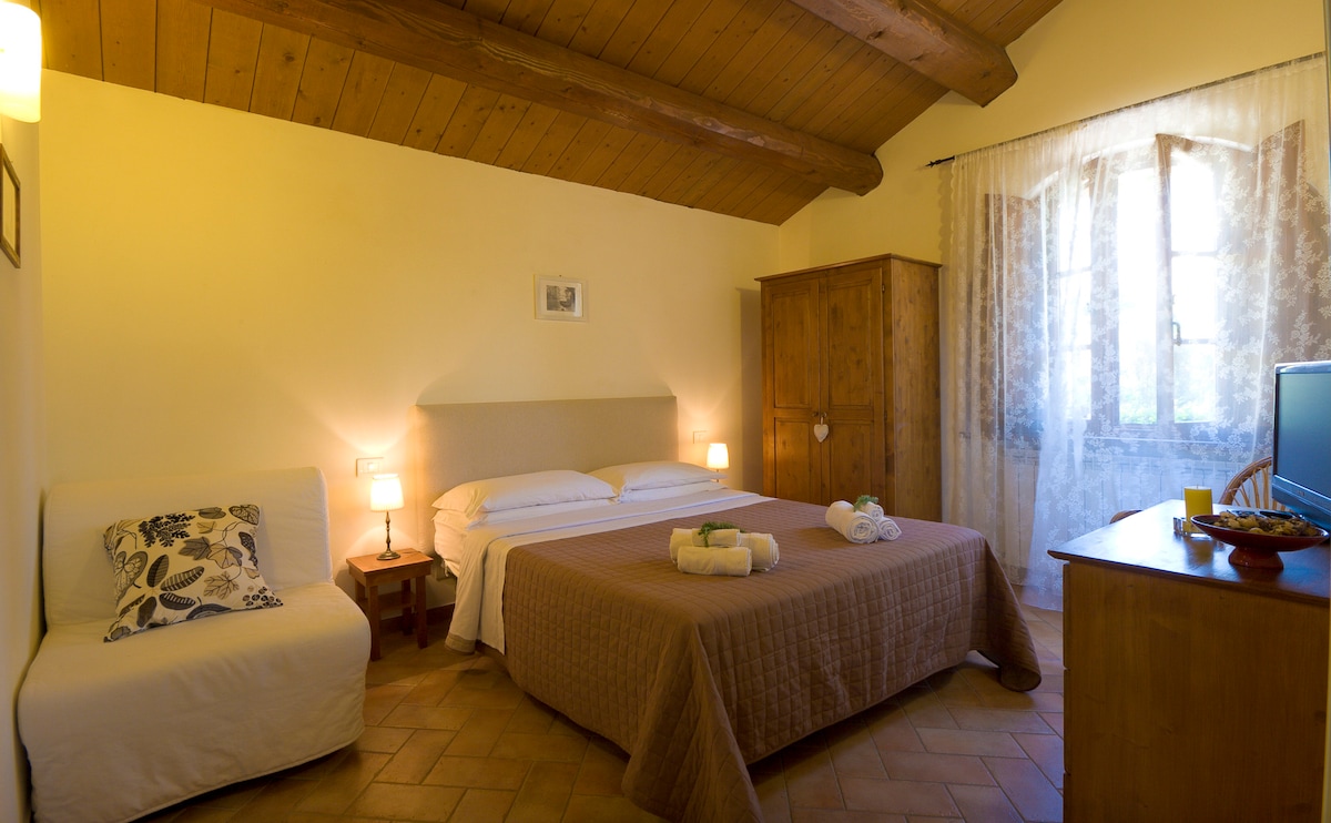 Suite matrimoniale "Minerva" – Una camera raffinata con letto king size per il massimo comfort, dotata di bagno en-suite con doccia, per un soggiorno all'insegna del relax. Possibilità di aggiunta letto singolo vista la spaziosità della suite. Vista sulla vallata , sulle montagne dei monti gemelli e sul parco secolare della villa.