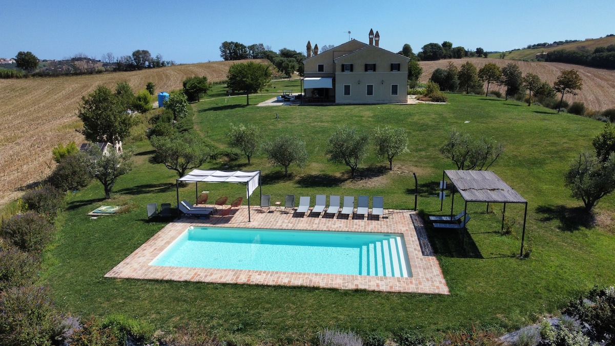 Rilassati con tutta la famiglia nella splendida campagna marchigiana a soli 4 km dal mare ! Nella casa colonica della nostra azienda agricola bio, l'appartamento con ingresso indipendente si affaccia sull'uliveto di famiglia e sullo storico bosco della Villa Bonaccotsi. Ha una zona giorno con cucina attrezzata e divano letto, una camera da letto matrimoniale, un bagno. Piscina a sfioro, arredamento outdoor e zona barbecue in condivisione con gli altri ospiti della struttura.