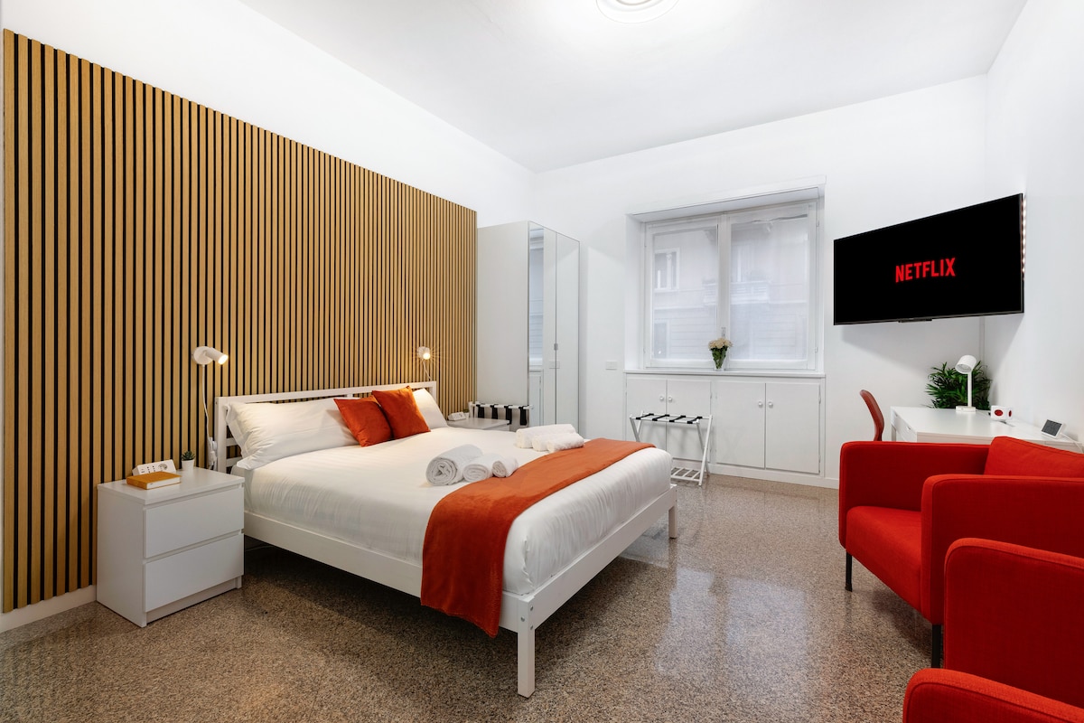 Welcome to our unique luxury loft in Porta Romana, one of Milan's most beloved neighborhoods. Steps from Piazza Cinque Giornate, this former printshop went through a meticulous gut renovation in 2024 to become an urban sanctuary replete with the finest Italian materials: oak herringbone floors, Venetian-style stucco walls, Verde Alpi marble, a custom-made travertine dining table, an oversize Cielo bathtub and handpicked Italian furniture.