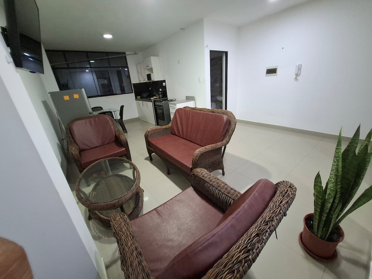 Mini departamento a 7 cuadras de la plaza de Tarapoto, zona tranquila y segura, cerca a farmacias, consultorios médicos y odontológicos, mini-markets, mercado, fácil acceso. Está ubicado en el 3er piso Contamos con -Plancha de ropa -Intercomunicador con portero eléctrico y apertura remota de puertas -Estacionamiento -Solo Ventiladores -Camaras de vigilancia -Extintores - Kitchenette, baño completo propio, barra de estudio, ventilador de techo y de piso, y todo lo necesario para cocinar